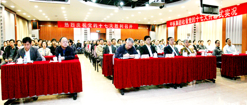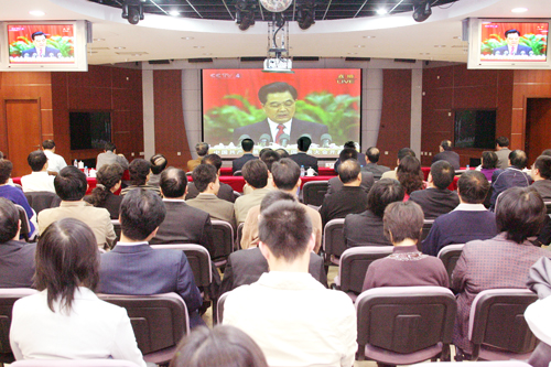 雖然因?yàn)槿藛T太多而略顯擁擠,但整個(gè)會(huì)場(chǎng)卻非常安靜,就連每逢會(huì)議難免嗡嗡作響的手機(jī)似乎也絕了聲。大家都在認(rèn)真地傾聽,有的詳細(xì)地做著記錄,有的還時(shí)不時(shí)地將身子輕輕探起,生怕錯(cuò)過(guò)電視里傳出的只言片語(yǔ)……10月15日上午,中核集團(tuán)公司黨組成員、副總經(jīng)理孫又奇,黨組成員王森,以及老領(lǐng)導(dǎo)趙宏、李忠良、錢福源等與集團(tuán)公司總部、檔案館、金原鈾業(yè)公司、新聞宣傳中心、二二一局的干部職工一起收看了中共十七大開幕式的現(xiàn)場(chǎng)直播,聆聽了胡錦濤總書記所作的報(bào)告。