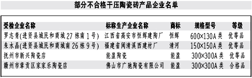 本報訊記者龔漢斌報道:近日,江西省質監(jiān)局公布了近期對干壓陶瓷磚產品進行省級產品質量監(jiān)督抽查的結果。質監(jiān)部門共抽查了51家生產企業(yè)生產的52批次產品,抽樣合格率90.4%。抽查結果表明,本次抽查的陶瓷磚其放射性核素限量指標均達到了標準規(guī)定的要求;但仍有部分產品存在一些問題。 本次抽查的5批次不合格產品中,有1批次產品的破壞強度達不到標準規(guī)定要求,兩批次產品的斷裂模數(shù)指標達不到標準規(guī)定要求。強度性能指標不達標易造成產品達不到應有的承重能力,在使用中產生開裂、破碎或表面缺陷等現(xiàn)象,影響產品的使用壽命和使用性能。有4批次產品的吸水率達不到標準規(guī)定要求。吸水率不達標,將影響消費者的正常使用。 對本次監(jiān)督抽查不合格的產品,省質監(jiān)局將依法嚴肅處理。